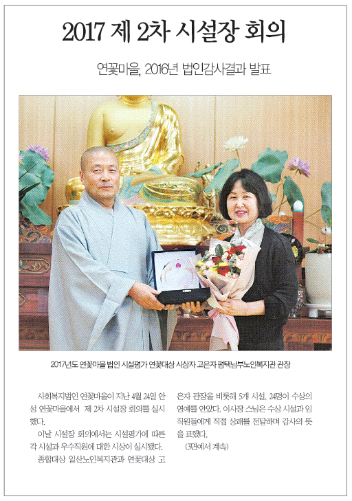 2017.05.15 -연꽃마을 신문(연꽃대상수상) 페이지 정보 작성일17-05-24 15:51 조회3,601회 댓글0건 관련링크 이전글 다음글 목록 본문 자세한 기자 내용은 아래 링크를 확인하세요.http://www.lotusvill.org/ 댓글목록 등록된 댓글이 없습니다. 이전글 다음글 목록